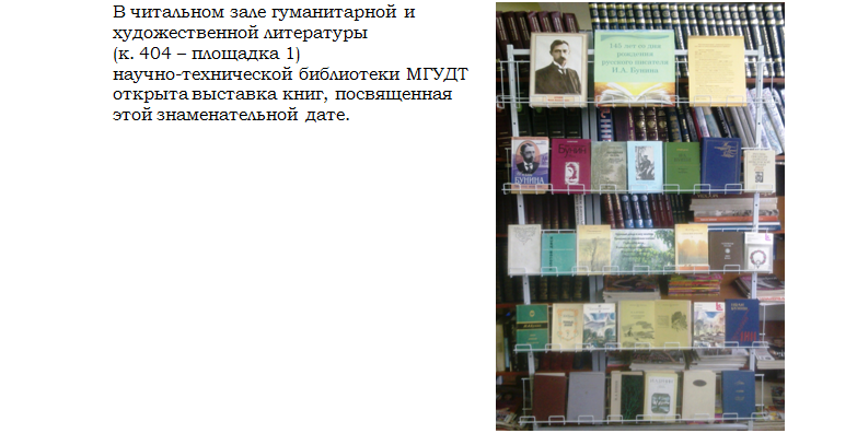 В читальном зале гуманитарной и художественной литературы (к. 404 – площадка 1) научно-технической библиотеки МГУДТ открыта книжная выставка, приуроченная к этому событию. На выставке представлены книги, учебники, монографии и журналы по дизайну, архитектуре, искусству костюма, обуви, текстилю и рекламе, материаловедению, производству нетканых материалов, аспектам продукции текстильной и легкой промышленности.