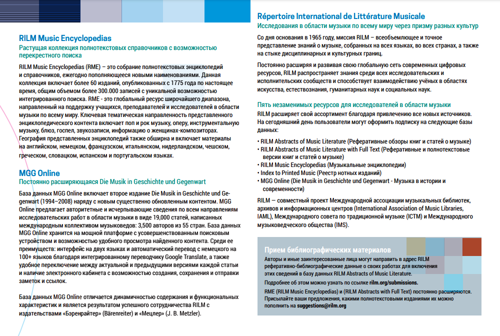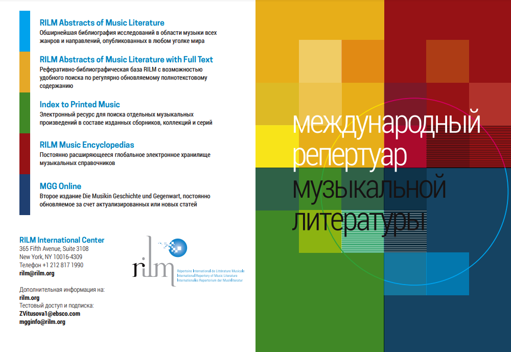 Компания EBSCO, ведущий поставщик зарубежных журналов и книг, в тестовом режиме с 15 сентября по 15 октября 2021 г. предлагает вам ознакомиться с Международным репертуаром музыкальной литературы RILM.
